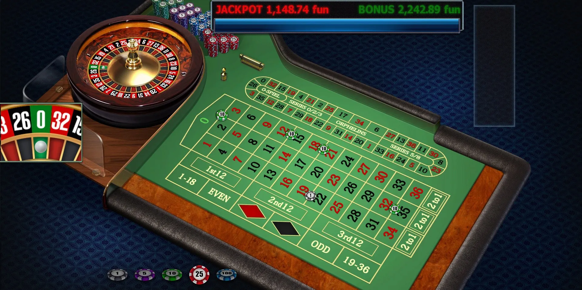 Visually, this roulette is almost indistinguishable from the European version. However, the difference becomes immediately apparent at the start. Two balls are shot in the direction opposite to the wheel’s rotation. If both stop at the same number, the maximum win with a coefficient of 1300:1 occurs.